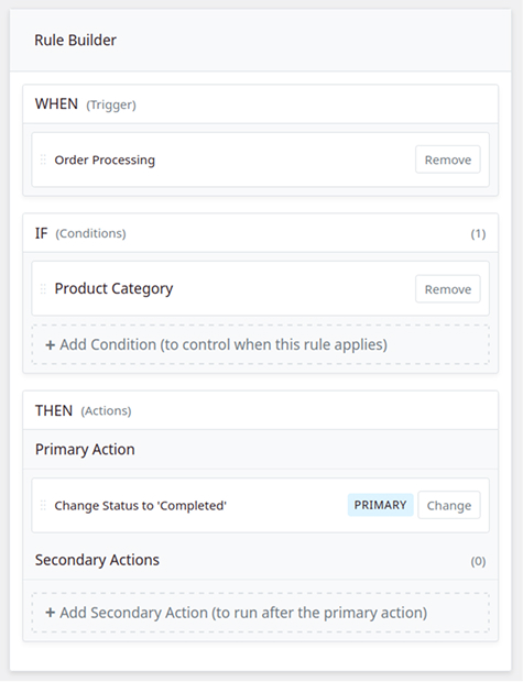 • This tells the rule to run immediately after an order is paid for and reaches “Processing” status